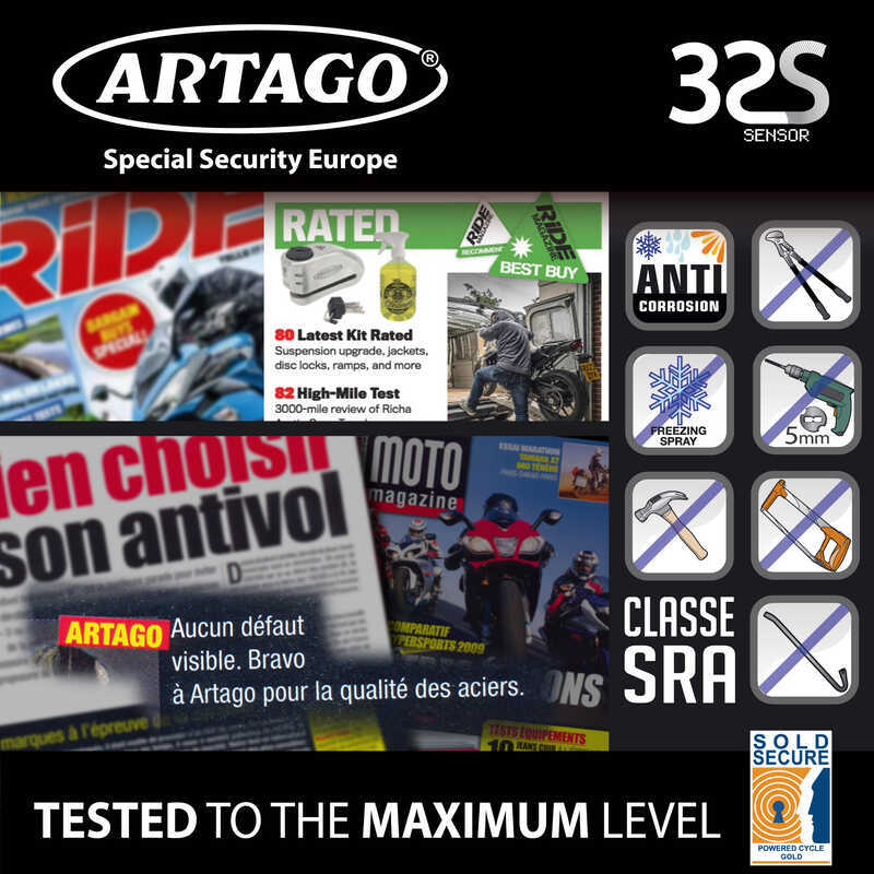 Gelince Haber VerMotosiklet güvenliğinde en ileri teknolojiyi temsil eden ARTAGO 32S, benzersiz S.A.A. üçlü kilitleme sistemi ile donatılmıştır. 15,5 mm sertleştirilmiş çelik şaftı, anahtar çevrildiğinde otomatik olarak açılan 3 çelik bilye ile kilitlenir. Böylece üç bağımsız kilit noktası oluşur ve ARTAGO’nun özel BUNKER SELECTION serisinin en güvenli disk kilidi haline gelir.