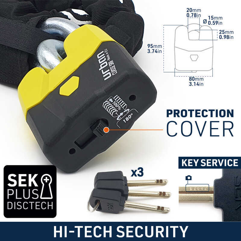 Zincir, URBAN U8K150 kilidiyle güvence altına alınır. 15 mm kalınlığında dayanıklı şakle, SEK PLUS DISCTECH silindir ve çift kilitleme sistemi ile donatılmıştır. Bu mekanizma, şaklenin her iki ucunu kilitleyerek saldırılara karşı direnci iki katına çıkarır. Koruyucu kapak, kilidi neme ve kire karşı korur.