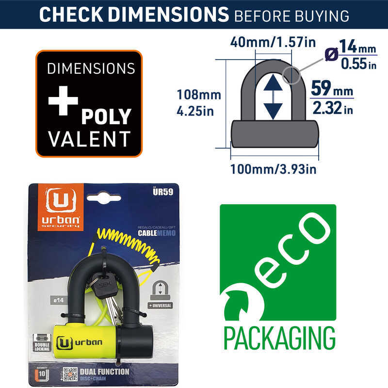 40x59 mm ölçüleriyle son derece kullanışlı ve evrensel bir yapıya sahiptir. Ön disk freni, arka teker zinciri kilitlemek veya güvenlik zinciriyle (dahil değildir) birlikte kullanmak için idealdir.