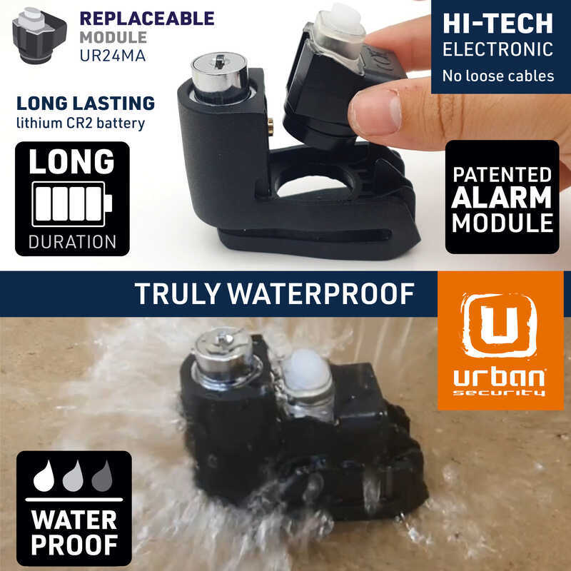 Alarm ile ya da alarmsız kullanımı tamamen size bırakır. Özel UYARI fonksiyonu ve A+ hassasiyet sistemi sayesinde hırsızları caydırır. 6 mm kilitleme pimi sayesinde tüm motosiklet, scooter ve bisiklet disklerine uyumludur. Eğer disk üzerinde daha büyük delikler varsa, çift kilitlemeli 10 mm pimli Urban UR10 modeli önerilir.